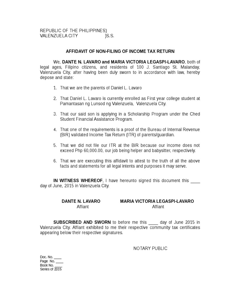 Affidavit Of Non Filing Of Income Tax Republic Of The Philippines Quezon City S Affidavit Of Studocu